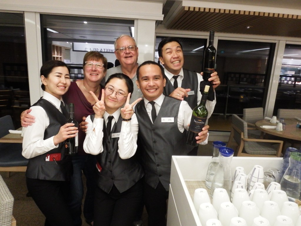 So when the restaurant was about to close and we were the only passengers left in the room I had a picture taken with the 3 and added Cholo, another server from the Philippines. He is next to me. Are we having fun or what?
