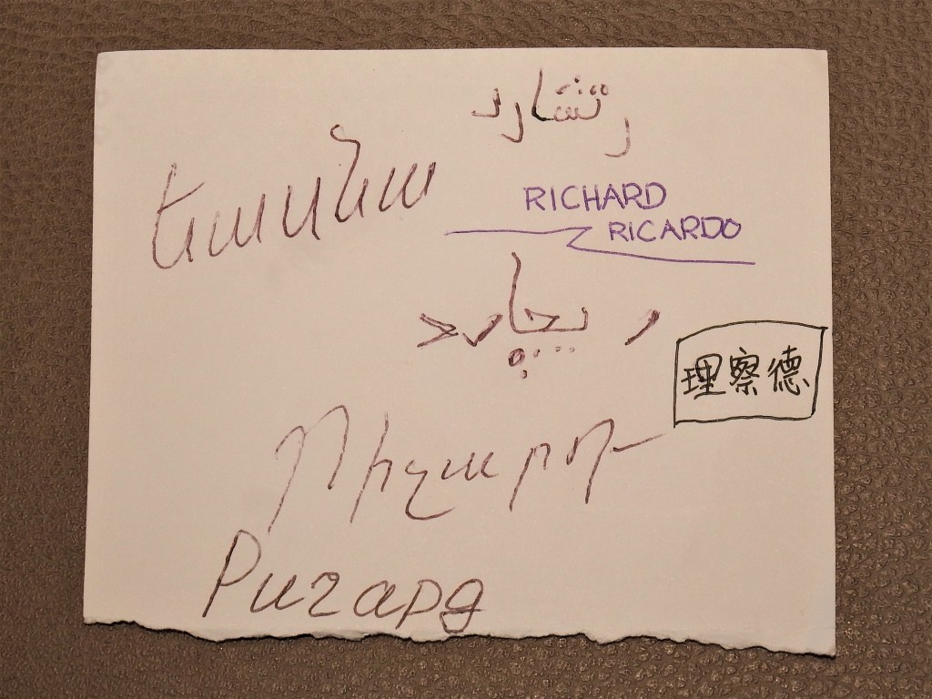 For dinner Kathy and I almost always get the same table in the World Café. That is the casual restaurant/buffet. We don’t get dressed up. Typically we get there just after it opens and we are almost always the last to leave. The table called “our table” is well known by the waitstaff. They aren’t allowed to put a reserved sign on it. But that is the standard joke. However, since it is a table for 4 we are generally joined by another couple. Sometimes we have known them and sometimes it is just random. On this one night it was totally random! The lady was born in Iran and moved to America. Her husband was just a quiet American but good fun. So as we sat there talking, I said I was an Arabic Linguist. So soon I took a small piece of paper and wrote my name in Arabic. She took the paper and wrote my name in Farsi (Persian). That just got things started. Our normal servers are Ardel from Philippines, Mengfei from China and Barchyn from Russia (although everyone thinks she is Chinese because of her looks). Each of these three saw the paper and asked about it. Soon all 3 had signed my name (or so they said) in their language. Then someone else came by and wrote my name and something else in their language. Unfortunately I forgot who that was or what language.
