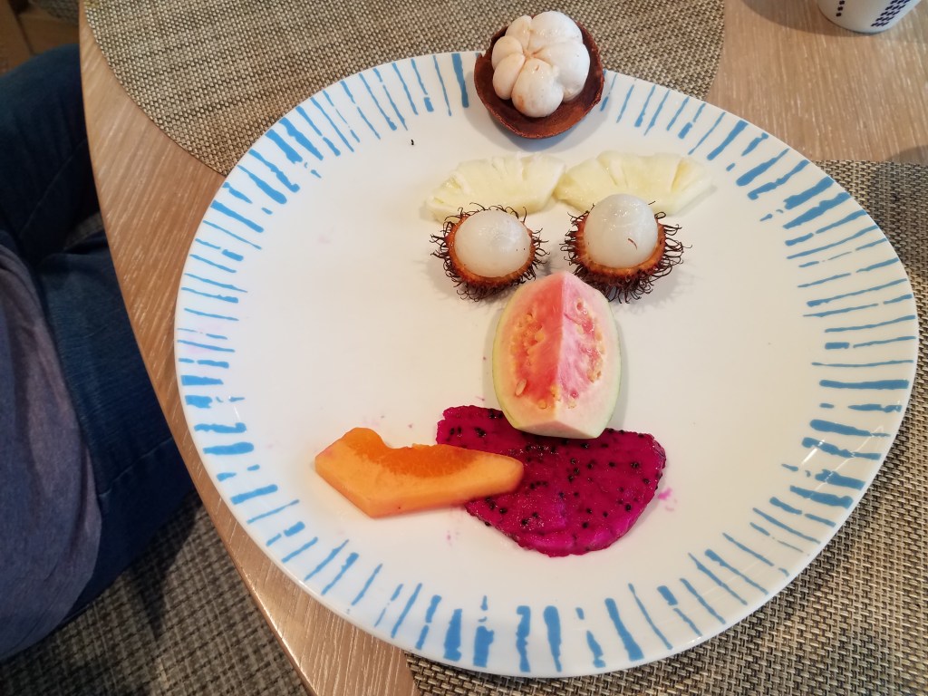 We sat at breakfast with some of our new Canadian friends, Rosemary and Bob. After some coffee, Kathy decided to get a plate of tropical fruit to try. Most we are not familiar with.