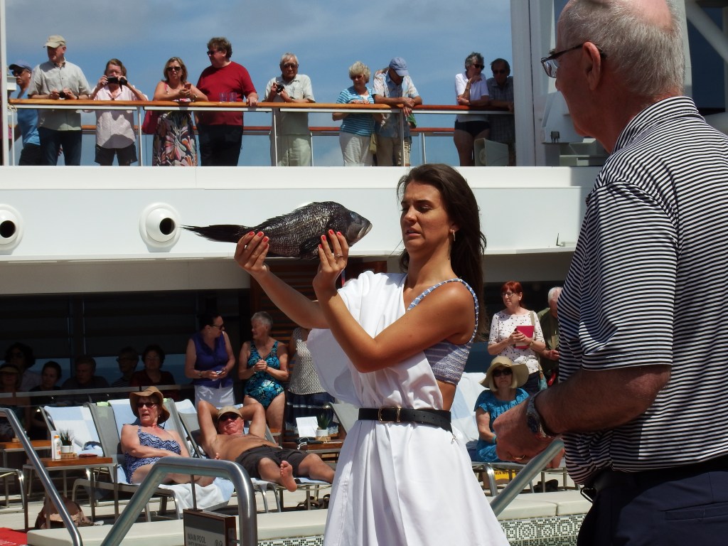 The ships crew who had never crossed the equator all went through the ceremony which included jumping in the pool and kissing the fish. This lady is one of the singers in the ship’s company. She wasn’t too excited with her opportunity.