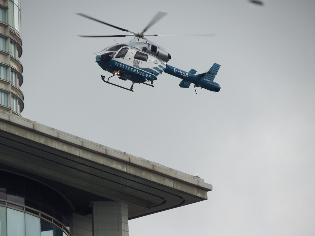 With so many tall buildings travel can be difficult. So if you can afford it another way to travel to work efficiently is by helicopter. This one is just landing at the top of an apartment building. Pretty cool.