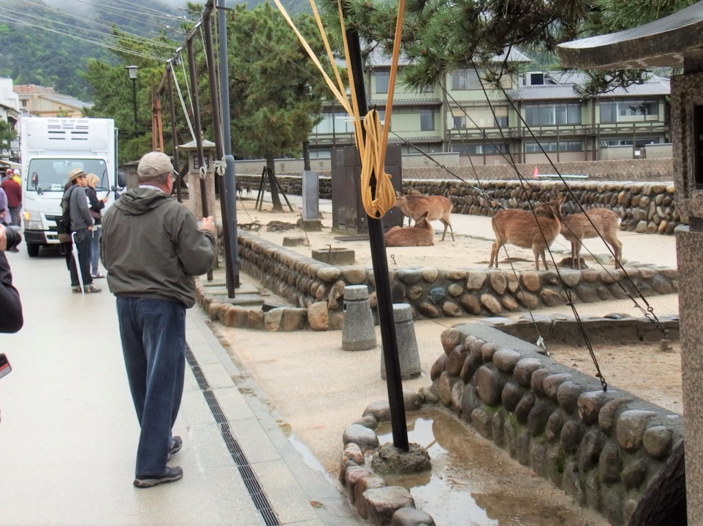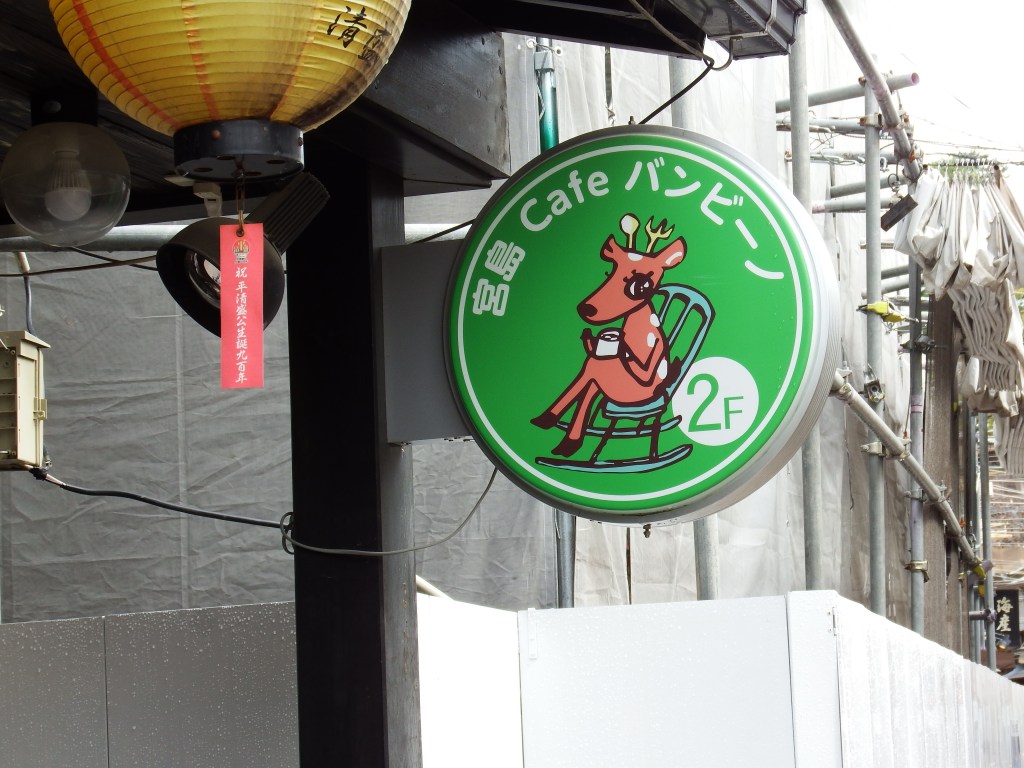 Even the cafes in the tourist area includes the deer. It was fun wondering the shops and the temple. One typical item used in Japan is a wooden rice paddle. So they are found in every tourist souvenir shop with pictures and Japanese letters. We wanted one and found a reasonable sized one with the shrine on it. I found a really nice one with the shrine carved into really good quality wood. Of course it was 6 foot tall. Not too practicle to bring home.