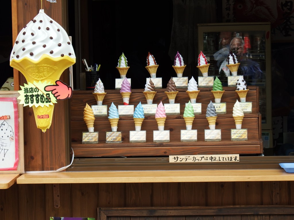 Being a tourist area they also sell lots of street food. Like ice cream. Notice all of the colors. What interested Kathy the most was the rally large cone with white ice cram and brown specs. Kathy was wondering with all of the deer roaming around in the crowd, what those brown specs were. There were lots of brown specs on the sidewalks. We avoided walking on them.
