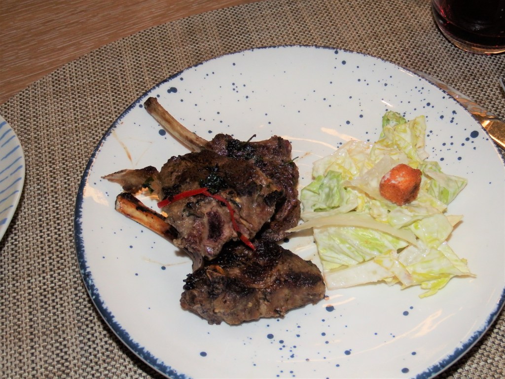 But now I have to explain dinner. We walked into the front door of the World Café. There is always a greeter at the door. We know most of them and even more of them know us. So the greeter started out by telling me there were lamb chops being served at the Pool Grill tonight. Okay. Then I walked by the hot serving section where our now good friend Gilbert serves. He stopped me and said there are lamb chops at the Pool Grill. Yes, I know. Then just before reaching “our table”, Armando the server said there are lamb chops at the grill. And that was all just to me. As Kathy walked by the Chef, he told her the same thing. Soooooo. I had lamb chops for dinner with a salad.