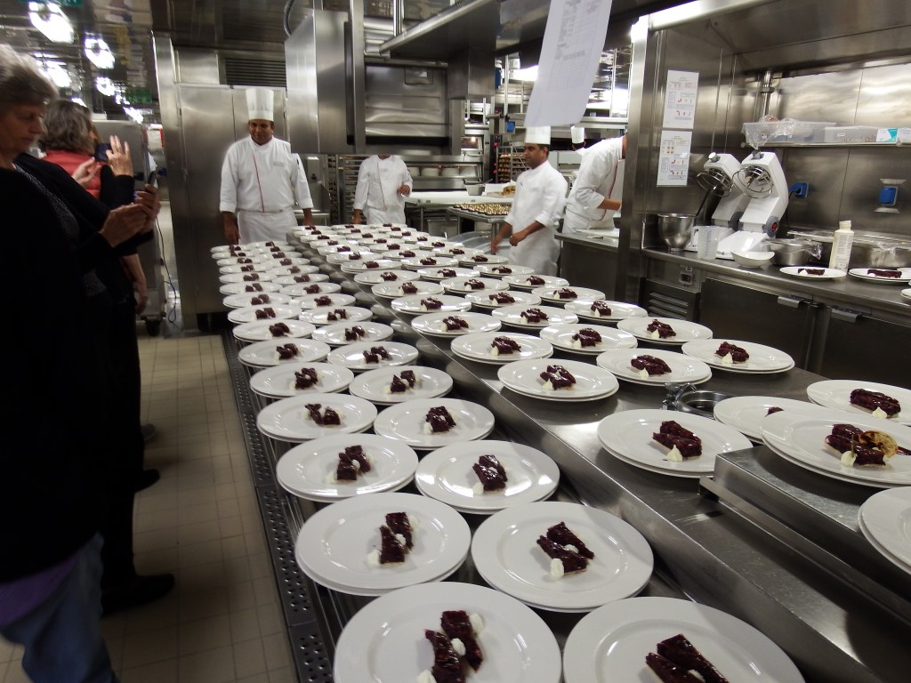 Later in the afternoon we went on a tour of the ship’s galley. I took a bunch of photos and had fun talking mostly about lamb with various chefs. But this photo stood out. Dessert for one of the restaurants. They estimate how many of everything based on past experience. Then anything that sits out more than 4 hours is thrown away. Thrown away on the ship means it is ground to basically mush and poured into the ocean for fish to eat.