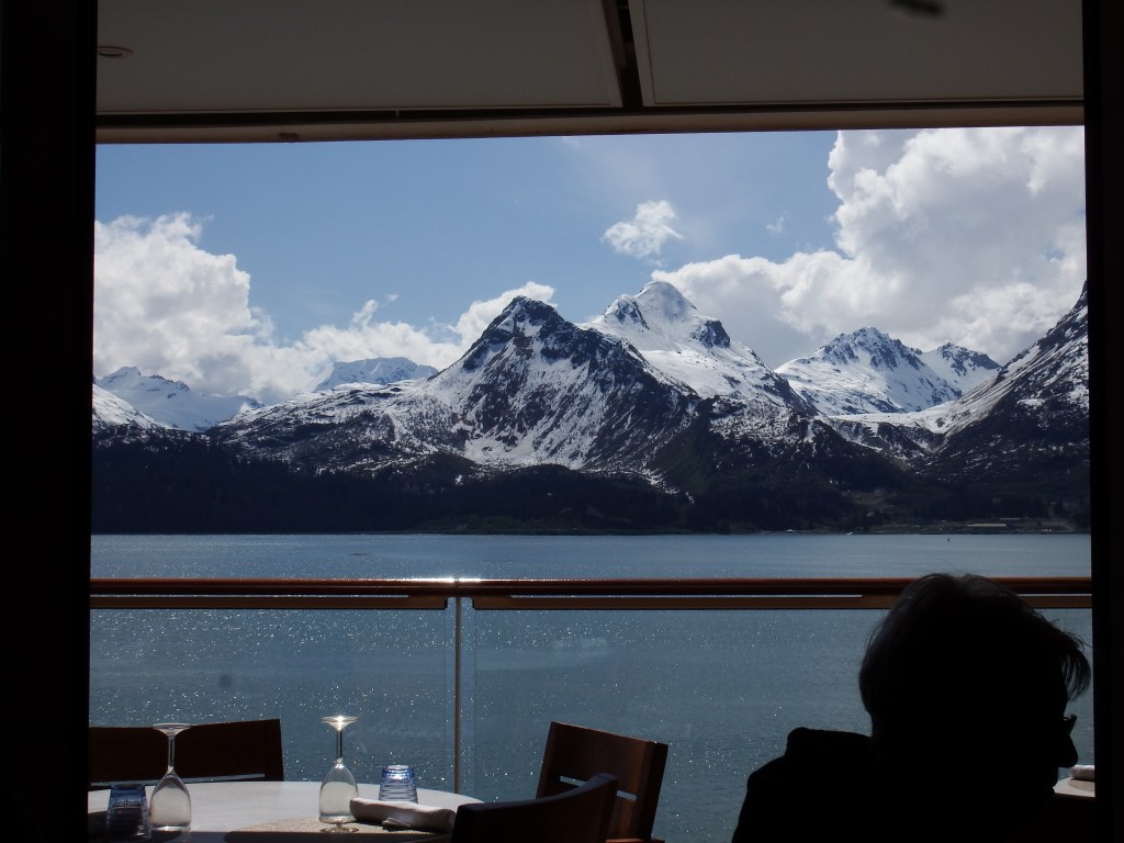 All of the doors were opened in the World Café. I took this photo from our table inside the restaurant. Beautiful mountains with a mostly blue sky. And the air was clean and clear. Much different from most of Southeast Asia. Of course there was snow. Nothing like that exists in Southeast Asia. Many of the younger crew members had a big smile looking at the snow. They had never seen it before being in Alaska.