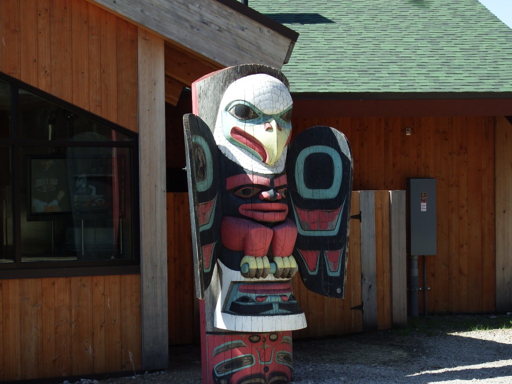 This is a small tribe of people. They have decided that to avoid intermarriage they are all eagles or ravens. An eagle cannot marry an eagle. Only a raven. Likewise a raven can only marry an eagle. And if they have kids, they are whatever the father is. These totem poles are the eagle and then the raven. We bought a raven print because the sales lady told us the story and she is a raven. Very nice lady.