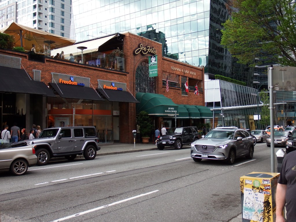 After settling in our room and having a nap we walked to our favorite restaurant in Vancouver. Joe Fortes. It was packed and we had no reservation. But after a wait outside we did get in. It is rated as the best seafood restaurant in Vancouver. No wonder we love it. And we had dinner alone. We have loved the company on board the ship. But today we sat at a small table by ourselves.