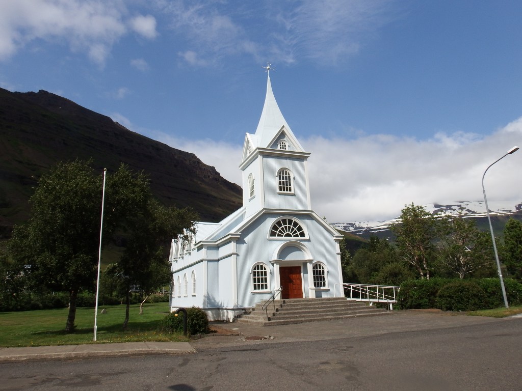 It has been overcast every day except yesterday afternoon it cleared a bit. So we walked into Seydisfjordur. The most famous building is the Blue Church.