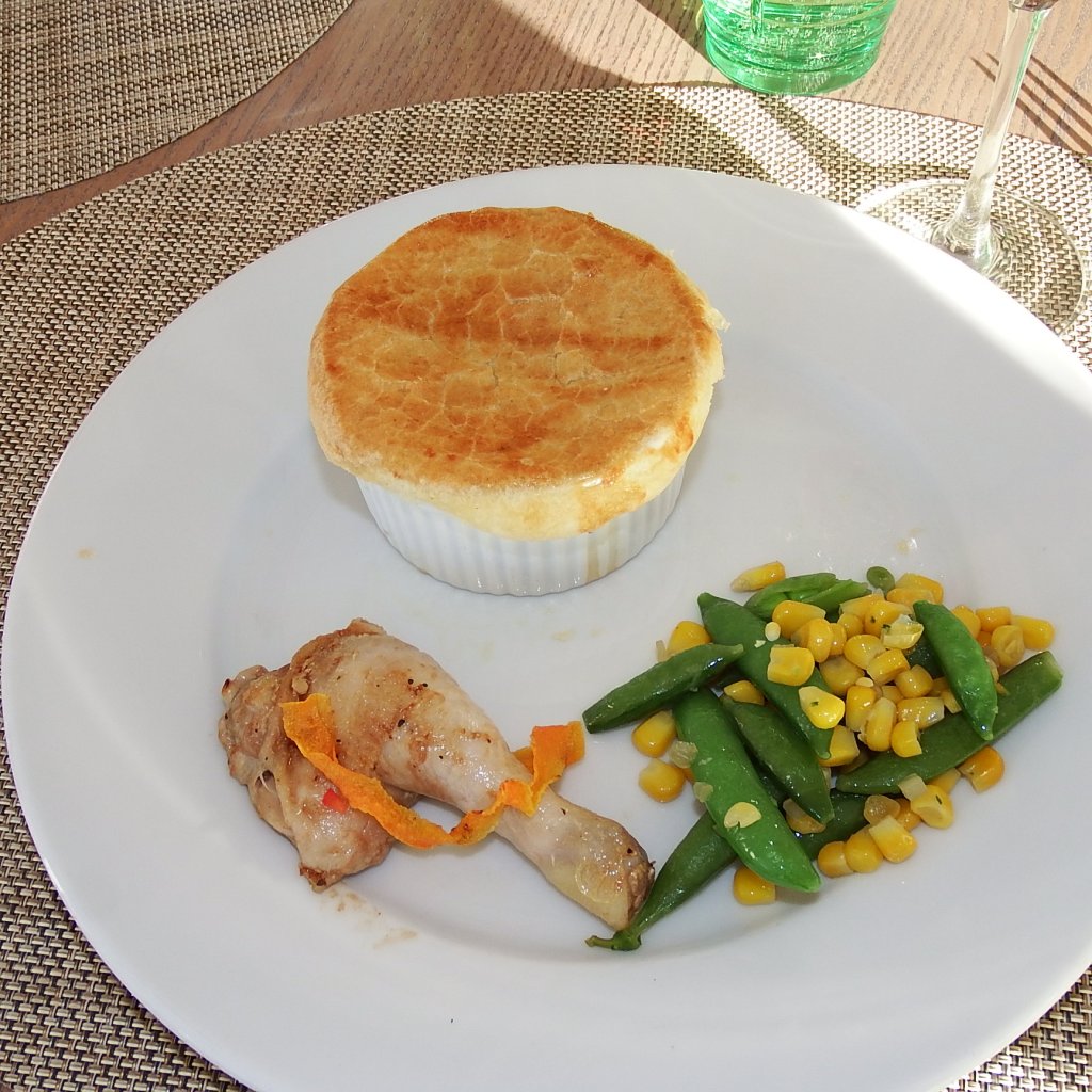For dinner I had a scallop pot pie and a Cornish chicken leg with some veggies.