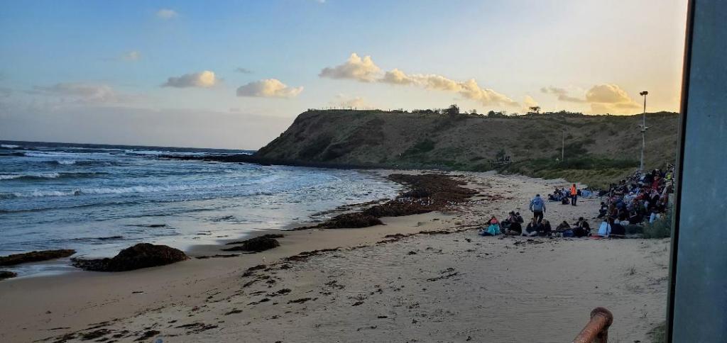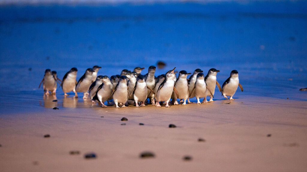 Today we took an excursion to what is called a Penguin Parade. These Little Penguins (their name somehow) have a home burrow on land and then go to the ocean to feed. They have a dark blue head and back with a white belly and are about 12 inches tall. According to the web there are about 32,000 of this type. After some extended time at sea eating small fish, they return home. But they are too scared to waddle across the open beach by themselves. So they gather into a group called a “raft” and get home together. It is called a Parade. They do this at dusk. No cameras are allowed because the flash scares them. I took a photo of a raft from the web. This was very similar to one of the rafts we saw.
