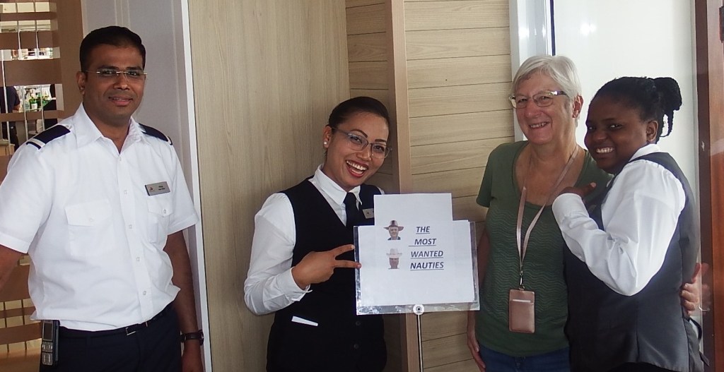 Philip, the gentleman on the left, had made a special sign and posted it on a stand at our table. Philip had taken our photos probably from the Viking registry and photoshopped them by adding hats. Then he typed “The Most Wanted Nauties”. We have a reputation. Dinner was a hoot. Many people stopped by.